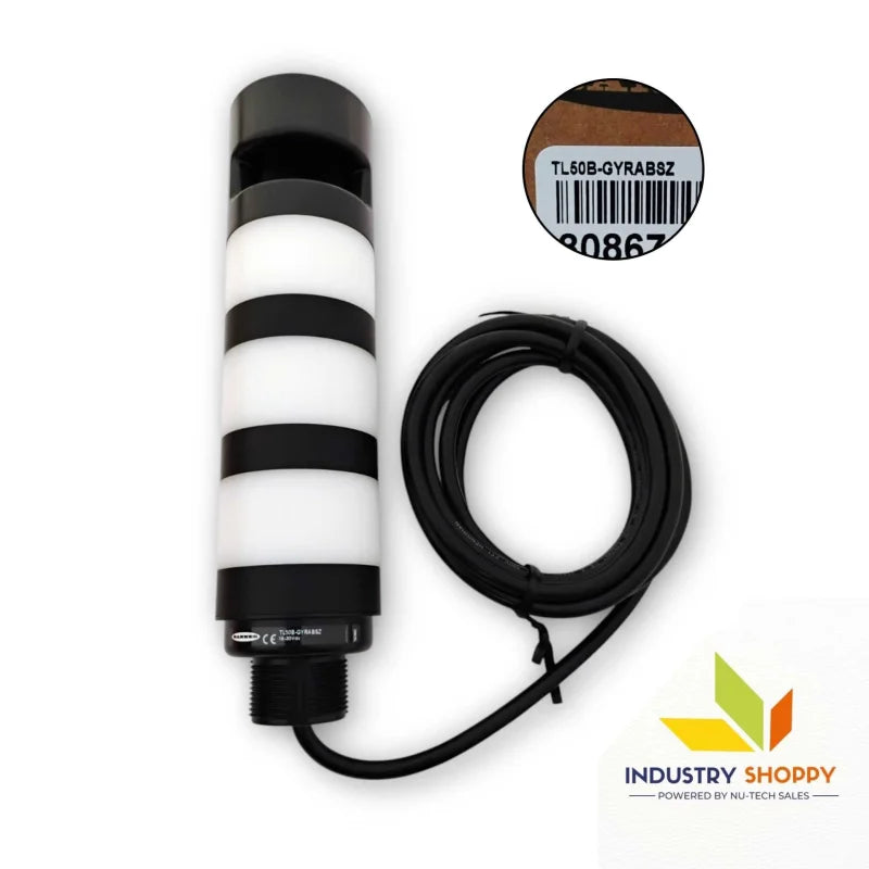 Equipped with four tower light segments, including a continuous audible alarm (92 dB at 1m), the TL50B-GYRABSZ offers both visual and audible signals for effective communication. It also has bimodal PNP/NPN input, allowing compatibility with different control systems.